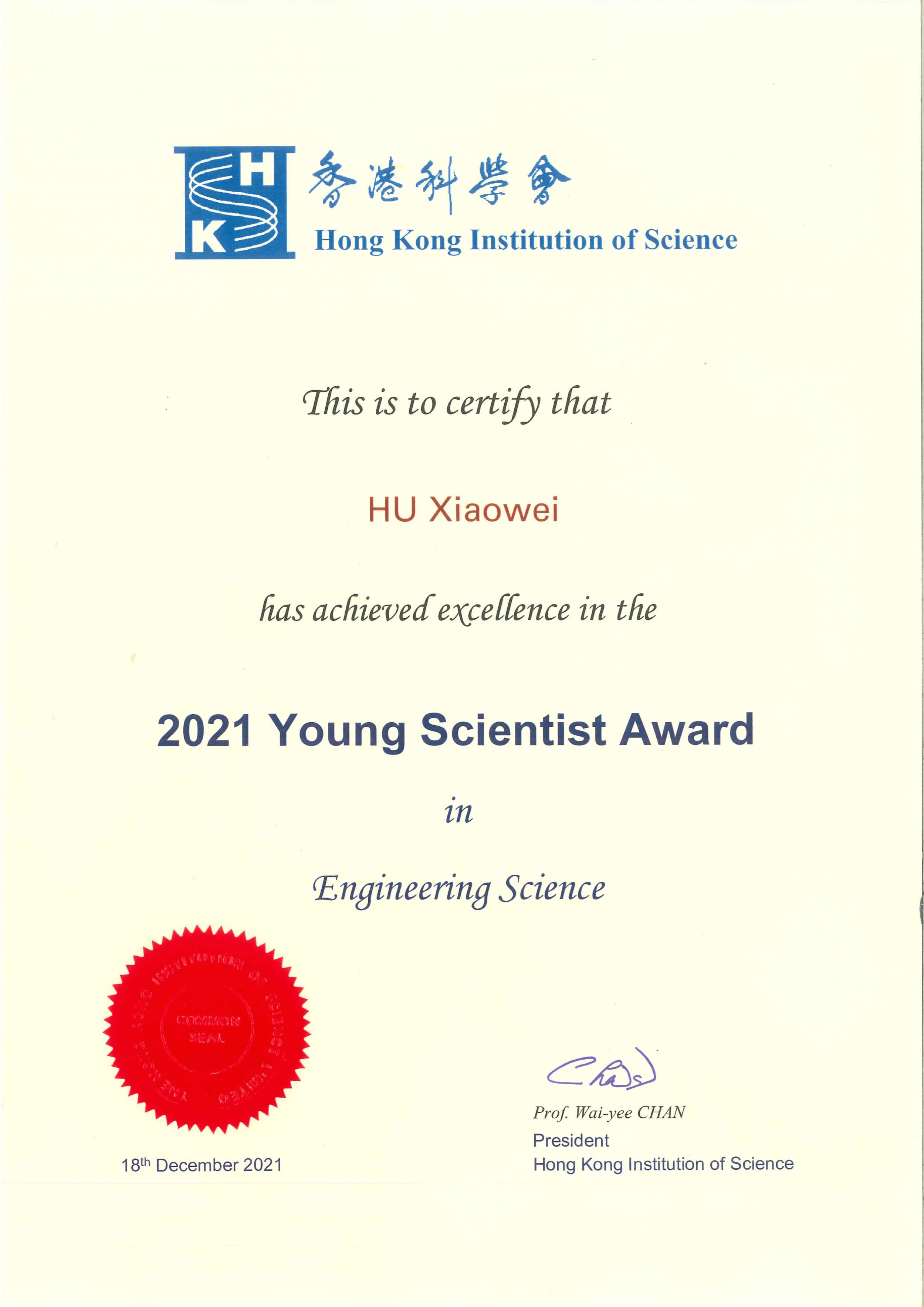 - Achieved Excellence in the Hong Kong Young Scientist Award 2021
